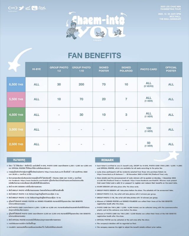 ความพิเศษที่ไม่ควรพลาด! งานแฟนมีตติ้งอย่างเป็นทางการครั้งแรกในประเทศไทยของ “อีแชมิน” พร้อมจัดเต็มโมเม้นต์สุดฟินด้วยกิจกรรม Hi-Bye (ไฮบาย) ให้แฟน ๆ ทุกที่นั่ง ได้สบตากันอย่างทั่วถึงแบบไม่มีตกหล่น! เหล่า CHAEMF เริ่มเลย! บูทเอเนอจี้ให้พร้อม เล็งที่นั่งที่ใช่ โซนที่ชอบ เตรียมพร้อมสำหรับการกดบัตร ในวันเสาร์ที่ 8 พฤศจิกายน 2568 ตั้งแต่เวลา 10.00 น. เป็นต้นไป ผ่านทาง www.feoh.co.th บัตรราคา 6,500 / 5,500 / 4,500 / 3,500 / 2,500 บาท