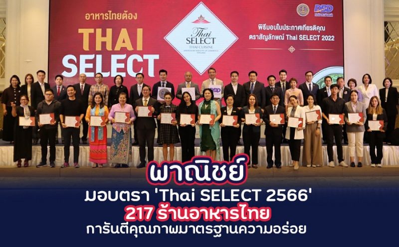 กระทรวงพาณิชย์ โดยกรมพัฒนาธุรกิจการค้า จัดพิธีมอบประกาศเกียรติคุณตราสัญลักษณ์ Thai SELECT ประจำปี 2565 ให้ร้านอาหารไทยที่ผ่านเกณฑ์คัดเลือกอย่างเข้มข้น 217 ร้าน ประกอบด้วย Thai SELECT SIGNATURE 12 ร้าน Thai SELECT CLASSIC 185 ร้าน และ Thai SELECT UNIQUE 20 ร้าน โดยร้านอาหาร Thai SELECT จะได้รับสิทธิประโยชน์ในการประชาสัมพันธ์ร้านค้าเพื่อสร้างการรับรู้แก่ผู้บริโภคในวงกว้าง โอกาสร่วมกิจกรรมส่งเสริมการขายจากหน่วยงานพันธมิตร และ Food Delivery Platform ชื่อดัง ภายใต้แคมเปญ ‘ชวน ฟิน กิน Thai SELECT’ เป็นการขยายโอกาสทางการตลาดแก่ธุรกิจร้านอาหารในประเทศให้เป็นที่รู้จักและผู้บริโภคเข้าใช้บริการมากขึ้น