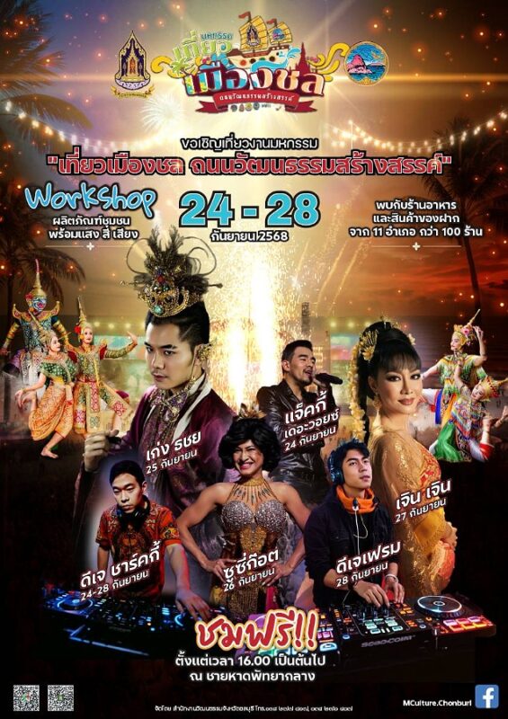 สำนักงานวัฒนธรรมจังหวัดชลบุรี ขอเชิญชวนทุกท่านร่วมงานมหกรรม “เที่ยวเมืองชล ถนนวัฒนธรรมสร้างสรรค์” ระหว่างวันที่ ๒๔ – ๒๘ กันยายน ๒๕๖๘ ณ บริเวณชายหาดพัทยากลาง พบกับกิจกรรมหลากหลายภายใต้คอนเซ็ปต์ “ชม ชิม ช็อป แชะ ชิล”