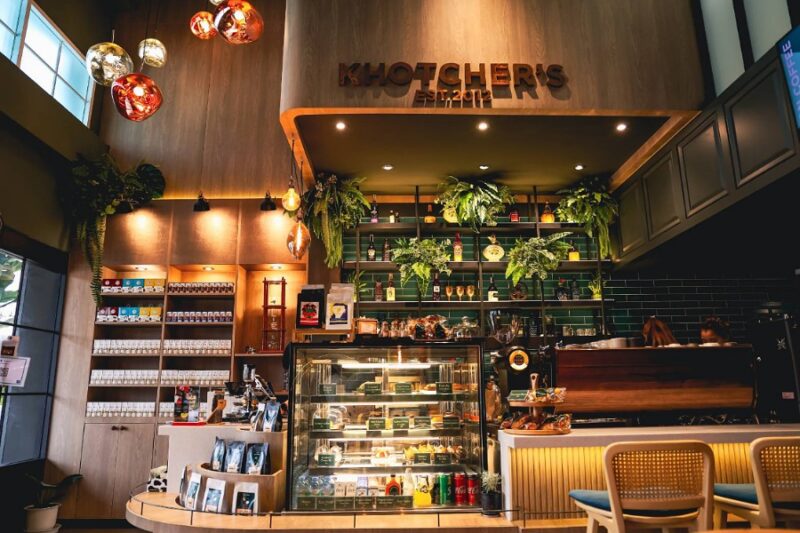“Khotcher’ s Cafe” ตั้งอยู่ในโครงการ เมโทร บิซทาวน์ เส้นสะพานพระราม 4 – ย่านราชพฤกษ์ จ.นนทบุรี เป็นโครงการทาวน์โฮม ทำเลย่านธุรกิจ การตบแต่งคาเฟ่สไตล์ modern luxury บรรยากาศข้างในหลังจากเข้ามาถึงคาเฟ่แล้วให้ความรู้สึก warm & cozy ด้วยสีเขียวเอิรธ์โทน และ สีดำ เฟอร์นิเจอร์ตบแต่งเป็นลายไม้ขัดเรียบ สีสว่าง สะอาดตา เป็นการตั้งใจออกแบบโดย คุณ กมลรัตน์ เต็งมณี เจ้าของร้าน จุดประสงค์ของการออกแบบร้าน เพื่อให้เข้าถึงความรู้สึกอบอุ่น สบาย ผ่อนคลาย เหมือนนั่งพักผ่อนอยู่ห้องนั่งเล่นที่บ้านที่ออกแบบมาให้ได้รับความสดชื่น รีแลกซ์ ไปกับ กรุ่นกลิ่นหอมของกาแฟ เครื่องดื่มเมนูแบบ signature รวมทั้งกลุ่ม เบเกอรี่ ขนมอบโฮมเมด ทำใหม่ทุกเช้า รอต้อนรับคุณในทุกวัน ร่วมเป็นส่วนหนึ่งในการสร้างสรรค์ไอเดียใหม่ ๆ เป็นจุดเริ่มต้นของการตามหาแรงบันดาลใจ หรือ หากท่านกำลังต้องการหาสถานที่ควรค่าแก่การนัดพบ สังสรรค์ ประชุมเล็กๆ หรือ เลือกเข้ามารับบริการเพราะต้องการผ่อนคลายกับวันดีๆ ให้คชเชอร์ เป็นจุดเริ่มต้นไอเดียและวันที่ดีของคุณในทุกวัน ร้านเปิดทุกวัน เปิดบริการตั้งแต่ 7.00น – 17.00น