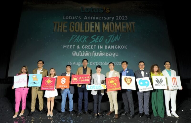 นางสาวเบญจวรรณ อ่องศรี ผู้อำนวยการอาวุโส สายงานบริหารพื้นที่ศูนย์การค้า โลตัส กล่าวว่า “โลตัสอยู่คู่คนไทยมายาวนานและปีนี้ เป็นการก้าวเข้าสู่ปีที่ 30 โดยโลตัส เดินหน้าในการเป็น SMART Community Center ศูนย์รวมการใช้ชีวิตแบบสมาร์ทของคนในชุมชน ผ่านการพัฒนาสาขาและพื้นที่ศูนย์การค้ารูปแบบใหม่ ที่มีร้านค้าครบครันตอบความต้องการของคนในชุมชน และมีพื้นที่รองรับการทำกิจกรรมของคนทุกวัย พร้อมจัดกิจกรรมที่ตอบสนองการใช้ชีวิตและเข้าถึงทุกไลฟ์สไตล์ของคนยุคใหม่ โดยปีที่ผ่านมาโลตัสมีกิจกรรมที่เชื่อมการลงทุนทองเข้ากับคนรุ่นใหม่ โดยจัดกิจกรรมร่วมกับพันธมิตรร้านทอง จัดกิจกรรมพิเศษ ซึ่งประสบความสำเร็จและได้รับเสียงตอบรับที่ดีมากจากลูกค้า ปีนี้เราจึงมีการต่อยอดกระแส K-Entertainment รับเทรนด์ความนิยมในวงการบันเทิงเกาหลีอีกครั้ง เพื่อเข้าถึงลูกค้ากลุ่มคนรุ่นใหม่มากยิ่งขึ้น จัดแคมเปญ “Lotus’s Anniversary 2023 ‘Golden Moment’ ฟินไม่พักกับพัคซอจุน” โดยร่วมมือกับพันธมิตรร้านทองและร้านค้าแบรนด์ดังในโลตัส นำ ‘พัคซอจุน’ นักแสดงภาพยนตร์และซีรีย์ชื่อดังจากเกาหลี จัดงาน Meet & Greet ครั้งแรกในไทย ที่พัคซอจุนจะมาพบกับแฟนคลับชาวไทยอย่างเป็นทางการ เพื่อสร้างโมเม้นและประสบการณ์ดี ๆ เอ็กซ์คลูซีฟเฉพาะลูกค้าโลตัส โดย Top Spender 2,500 ท่านแรก ที่สะสมใบเสร็จจากการซื้อทองจากร้านพันธมิตร ได้แก่ ห้างทองเยาวราชกรุงเทพ, ห้างทองเยาวราชสินทวี, ห้างทองออโรร่า, ห้างทองหวังโต๊ะกัง, บางกอกโกลด์ หรือสะสมใบเสร็จจากการซื้อสินค้าและบริการจากร้านค้าทุกร้านในพื้นที่ศูนย์การค้าโลตัส อาทิ แว่นท็อปเจริญ, บีควิก, Ottrti, Wacol, Collar Tea, Major Cineplex รับสิทธิ์เอ็กซ์คลูซีฟเข้าร่วม Meet & Greet กับพัคซอจุน พิเศษ เมื่อช้อปสินค้าในโซนซูเปอร์มาร์เก็ต ก็สามารถลุ้นสิทธิ์รับเลือกเป็น Lucky Fan อีกจำนวน 500 ท่าน เพื่อเข้าร่วมกิจกรรม Meet & Greet ด้วย โดยสามารถสะสมยอดซื้อได้ตั้งแต่วันที่ 16 สิงหาคม – 8 ตุลาคม 2566 ที่โลตัสสาขาใหญ่ไฮเปอร์มาร์เก็ตทั่วประเทศ”
