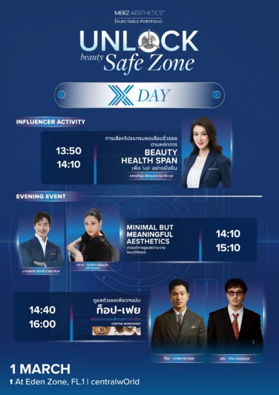 ร่วมปลดล็อกความสวย เซฟด้วยมาตรฐานความปลอดภัยสูงสุดในงาน “UNLOCK BEAUTY SAFE ZONE” ได้ตั้งแต่วันที่ 27 กุมภาพันธ์ – 1 มีนาคม 2569 ณ โซนอีเดน ชั้น 1 ศูนย์การค้าเซ็นทรัลเวิลด์ ติดตามรายละเอียดเพิ่มเติมได้ที่ Facebook: Merz Aesthetics Thailand และ Line OA @merzbeautyconnect