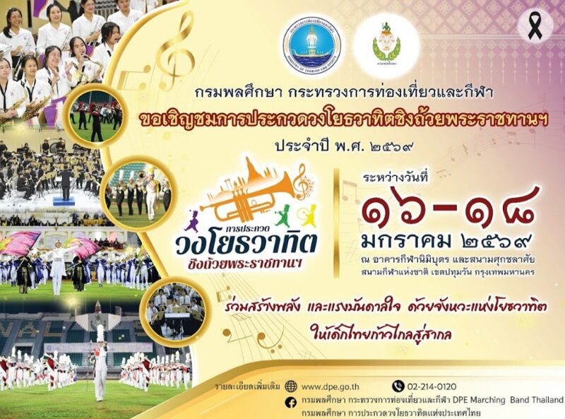 กรมพลศึกษา กระทรวงการท่องเที่ยวและกีฬา ขอเชิญร่วมชม ร่วมเชียร์ การประกวดวงโยธวาทิตชิงถ้วยพระราชทานฯ ประจำปี พ.ศ.2569
