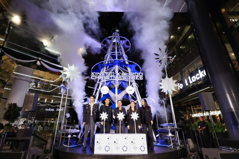 ต้นคริสต์มาสอัพไซเคิล “Kinetic Kaleido Christmas Tree” ดีไซน์ในคอนเซ็ปท์ The Cosmic Origami of Light โอริกามิแสงแห่งจักรวาลที่ถ่ายทอดความงดงามของศิลปะและเทคโนโลยีเข้าด้วยกัน ที่รังสรรค์ขึ้นจากโมดูลรูปทรงโอริกามิซ้อนต่อกันอย่างประณีต โครงสร้างสีเงินเมทัลลิก ส่องประกายด้วยเส้นแสง LED ไล่เฉดนีออนแบบกราเดียนต์ เผยลวดลายเรขาคณิตคล้ายภาพคาไลโดสโคปที่เคลื่อนไหวตามแรงลมอย่างมีชีวิต ก่อให้เกิดการเคลื่อนไหวที่สวยงามในทุกมุมมอง ผู้ชมสามารถเดินชมรอบต้นคริสต์มาสได้แบบ 360 องศา เพื่อสัมผัสประสบการณ์แห่งแสง สี และการเคลื่อนไหวอันดื่มด่ำราวกับหลุดเข้าไปในอวกาศของแสงแห่งศิลปะ